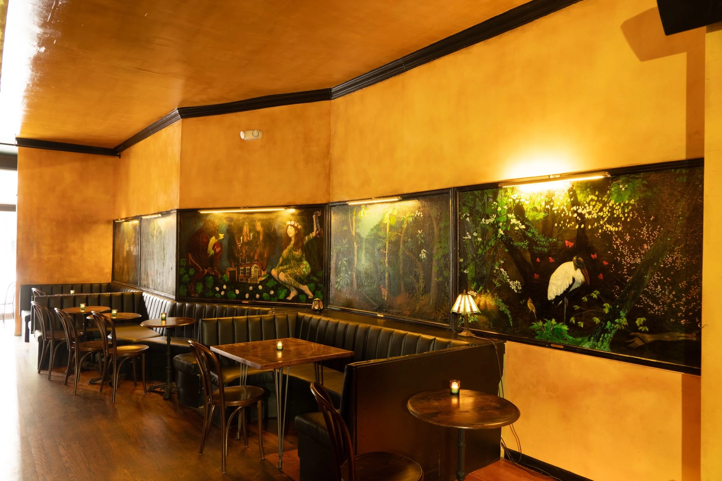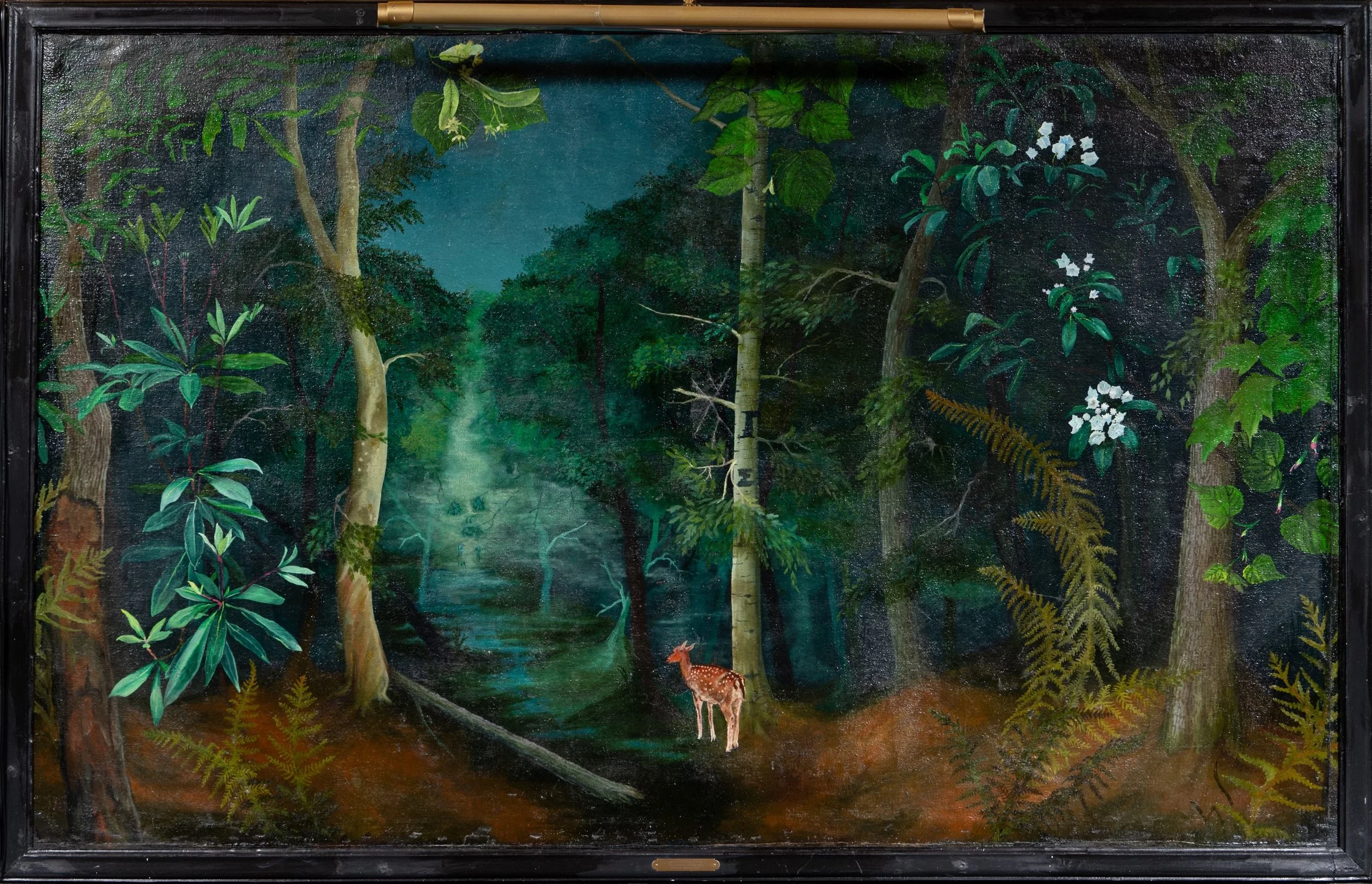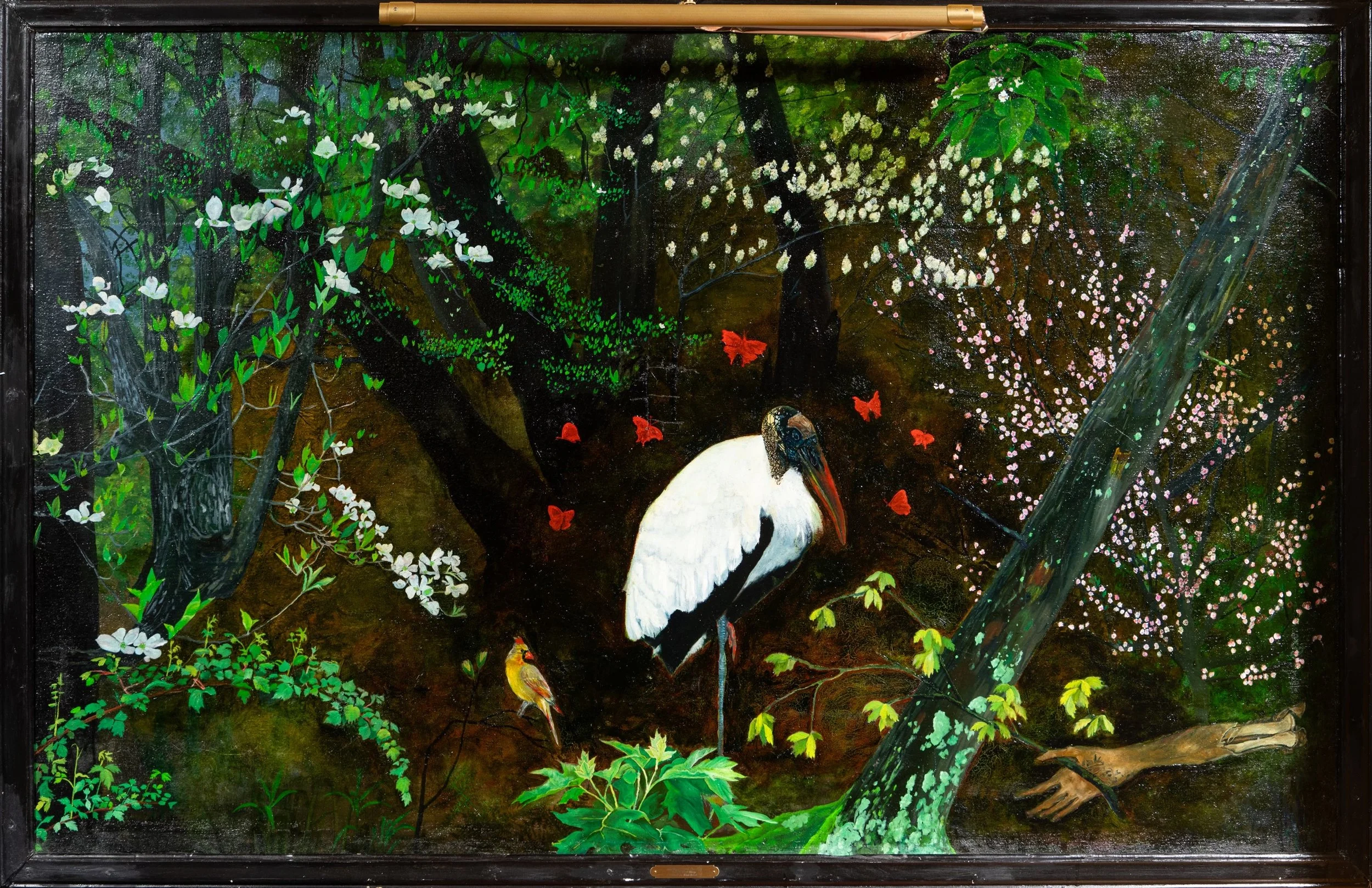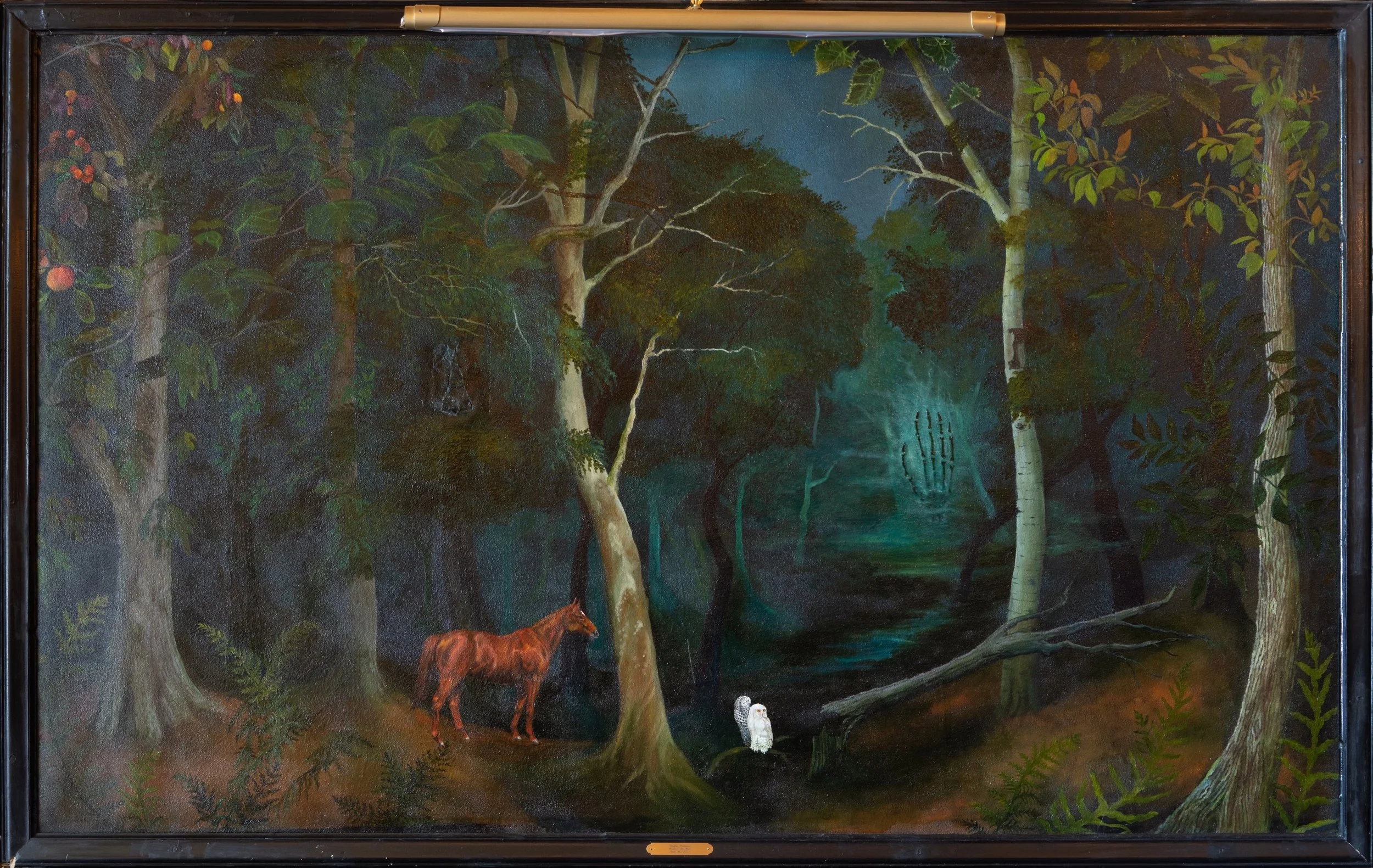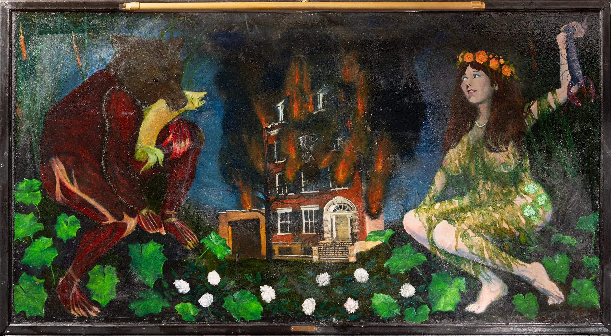 At the Kite, you will find artist Nina Nichols' paintings of Manhattan after humans disappear. Native trees thrive and spirits inhabit this space. The far left canvas depicts a rocky peak in the Catskills in the dead of winter with the spirit of the living stump. Next to it, the fall owls, wild horse, and the disembodied hand. In the central canvas, Annie Sprinkle (the embodiment of ecological and corporeal freedom) and the Naked Bear (an early spirit described by the Iroquois) burn down the Merchant’s house, the oldest structure in Manhattan. To their right, the summer fawn and the giant cannibalistic head emerge from lush springtime woods. To the far right is the mummified arm of Antietam, an old spirit discovered on a battlefield in Maryland, amid the summer foliage and the spring wood stork. Manhattan is bursting with underground rivers, shifting limestone, wild birds and creeping forest dripping, germinating and spawning in rapid succession all around and underneath us in perpetuity.